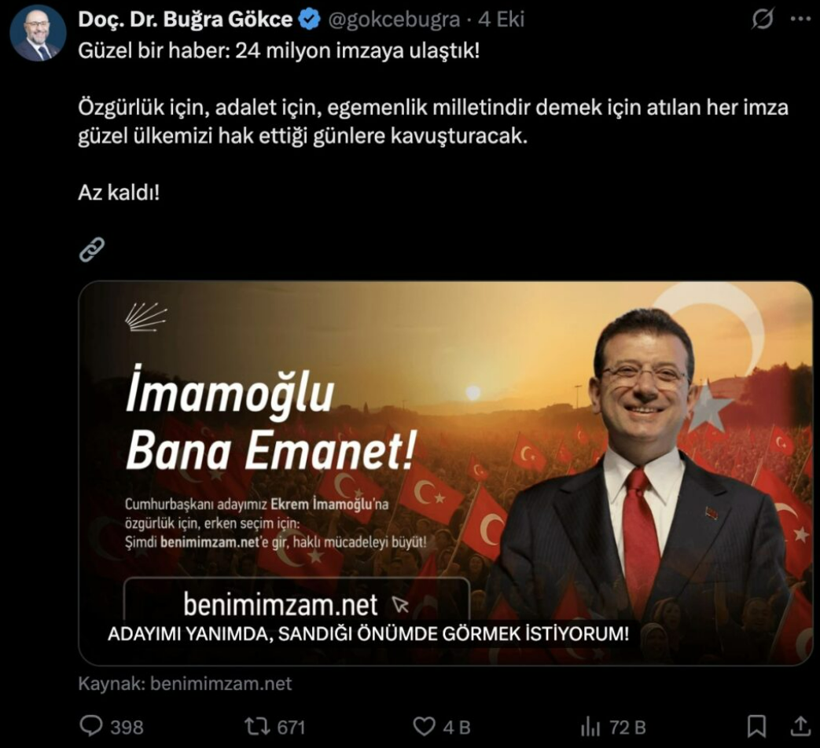 “Güzel bir haber: 24 milyon imzaya ulaştık! Özgürlük için, adalet için, egemenlik milletindir demek için atılan her imza güzel ülkemizi hak ettiği günlere kavuşturacak. Az kaldı!”